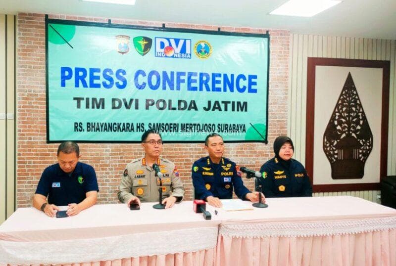 Kabid Humas Polda Jatim Kombes Pol Jules Abraham Abast bersama dengan tim gabungan Disaster Victim Identification (DVI) menggelar press conference update penanganan identifikasi korban ambruknya mushola Ponpes Al Khoziny, Sidoarjo.