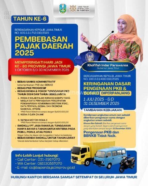 Program pembebasan pajak ini berlaku mulai 1 Oktober hingga 30 November 2025, berdasarkan Keputusan Gubernur Jawa Timur Nomor 100.3.3.1/712/013/2025.